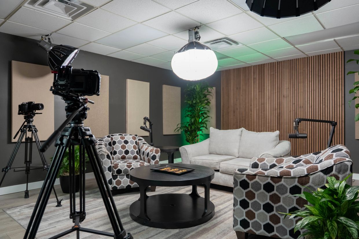 Studio C offers a clean, intimate environment perfect for two-person interviews, podcasts, or coaching sessions.