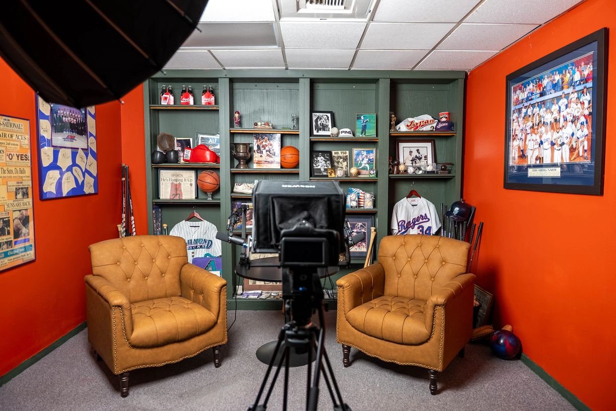 The Sports Room features classic memorabilia, warm lighting, and a two-chair setup designed for interviews, podcasts, or highlight discussions. Whether you’re breaking down a game, sharing a comeback story, or filming sports content with character — this room brings that vintage locker-room energy to the camera.